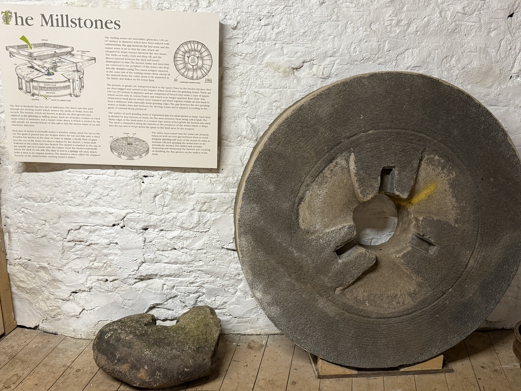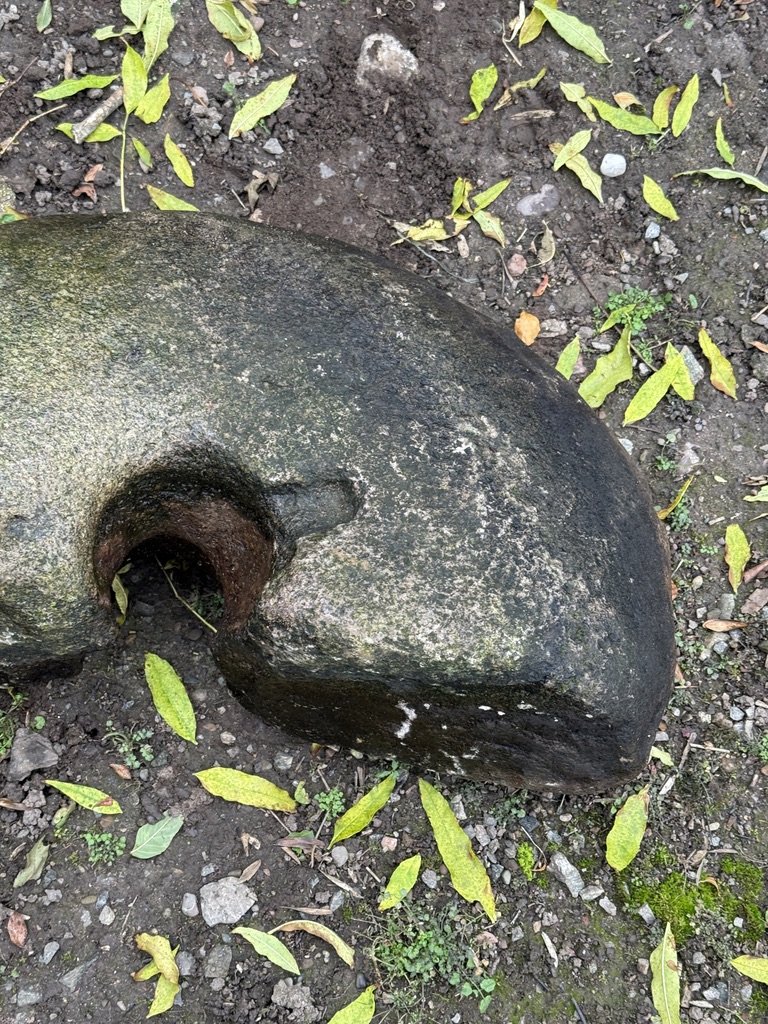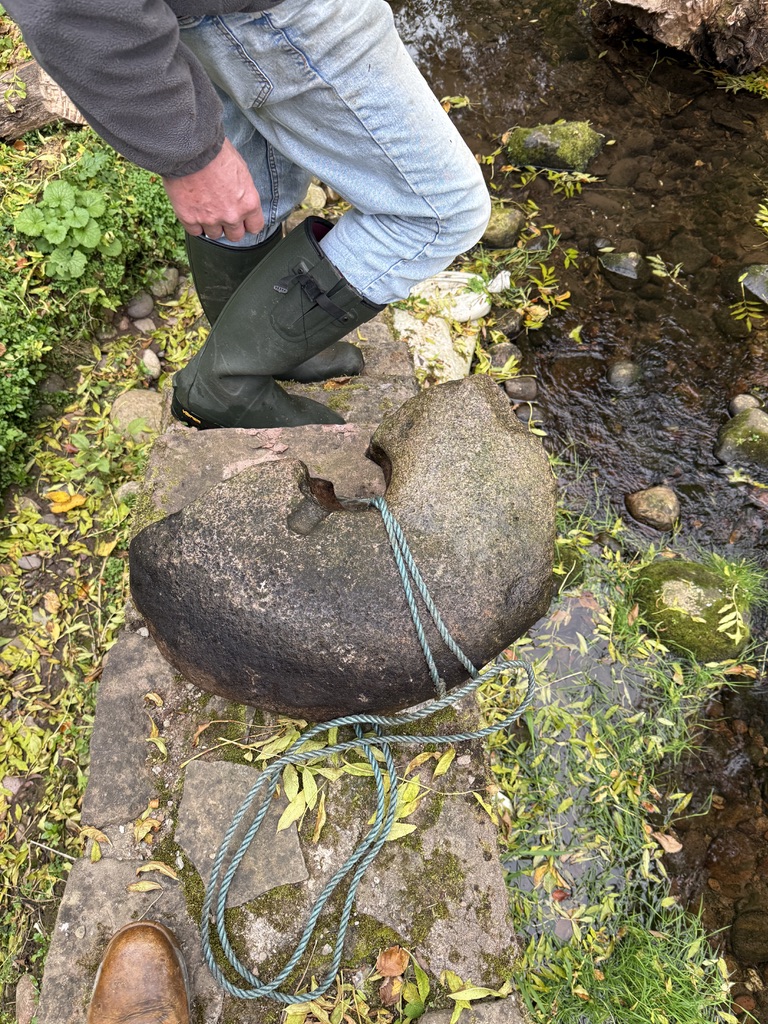 In 2025 an old millstone was found in the Burn of Benholm near the Mill of Benholm. Historic Environment Scotland commented on thre find as follows “”It is the upper part of a millstone but a lot smaller than if it were in a conventional vertical watermill in which stones rotate on a vertical spindle via gearing from a water wheel with a horizontal axle. I think it is not a hand quern because I don’t see a drill hole towards the outer edge for a handle. It could be on the missing piece but I don’t see evidence of it where the stone is broken. There was an iron strap across the top hole through which the grain to be ground is poured, and I think this means it was a powered set of millstones, the rotation coming from below to turn the upper stone, and adjustments able to be made to keep them just the right distance apart. A quern stone would simply be lifted up and use its own weight to stay in place. It wouldn’t be held in place by an iron bar. Sometimes old mill stones like this would be re-used as the hinge for a door, at thresholds of cottages in the highlands, and are I think evidence that horizontal mills were more widespread than hitherto thought. There recently has been found evidence in the Trossachs at Killin Mill for the base stone on which a horizontal or Norse Mill rotated. The place in Scotland where most horizontal mills survive is Shetland, or you can visit the Historic Scotland property Click Mill in Dounby, Orkney, but as well as in Norway there are large numbers in Southern Europe, from Iberia to the Balkans. It is exciting to have more evidence coming from Scotland south of the Highlands, if it is the stone of a horizontal mill. It used the kinetic energy of a jet of water, not needing a large volume of water provided there is a sufficient fall, which I think is the case at Benholm Glen. As for dating I’d agree that it belongs to a predecessor to the mill that was built in 1711. It might even be medieval.”